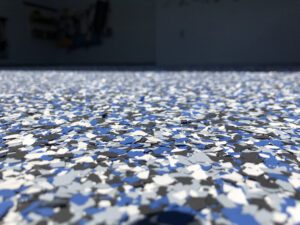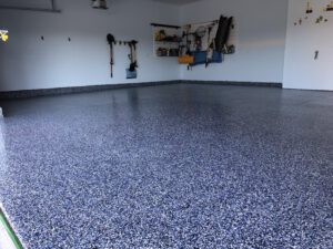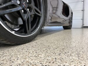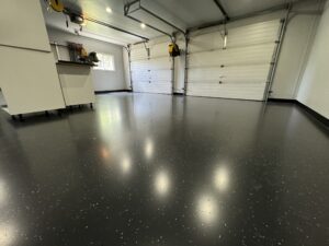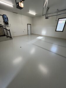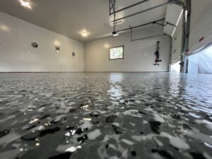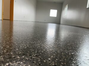 Our technicians will next clean the floor and apply a base coating. Next comes the epoxy, which we’ll cover with Flake, and the following day the surface will be swept to scrape away any surviving shavings and particles.