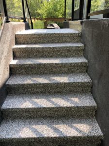 After a comprehensive assessment, during which we’ll study the integrity of the surface and learn your stylistic preference, we’ll grind the entire floor in preparation for installation. This process will remove existing imperfections, and we’ll also repair any cracks or broken concrete. The grinded surface will then allow the epoxy to bond to it.